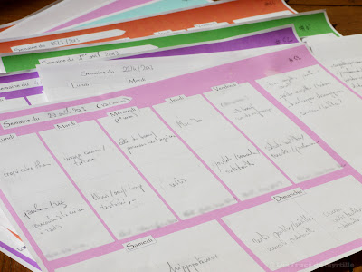 En vrai, je ne planifie pas d'un coup mes menus pour toute la semaine, c'est trop difficile pour moi, mais je note au fur et à mesure les idées sur mes plannings hebdomadaires, au crayon à papier pour pouvoir déplacer les menus en fonction de mon courage, des restes, des imprévus ou tout simplement des courses.
